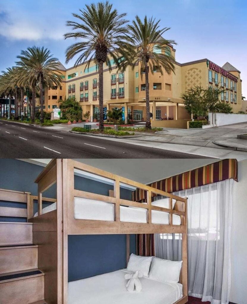 This hotel is located behind Cars Land, is a fast walk to the park, and has a free breakfast. We’ve stayed here twice in the 1-bedroom suite with a bunk bed. There was a king-sized bed in one room and an interior door separating us from the “kid room,” which was a bunk room with double beds.