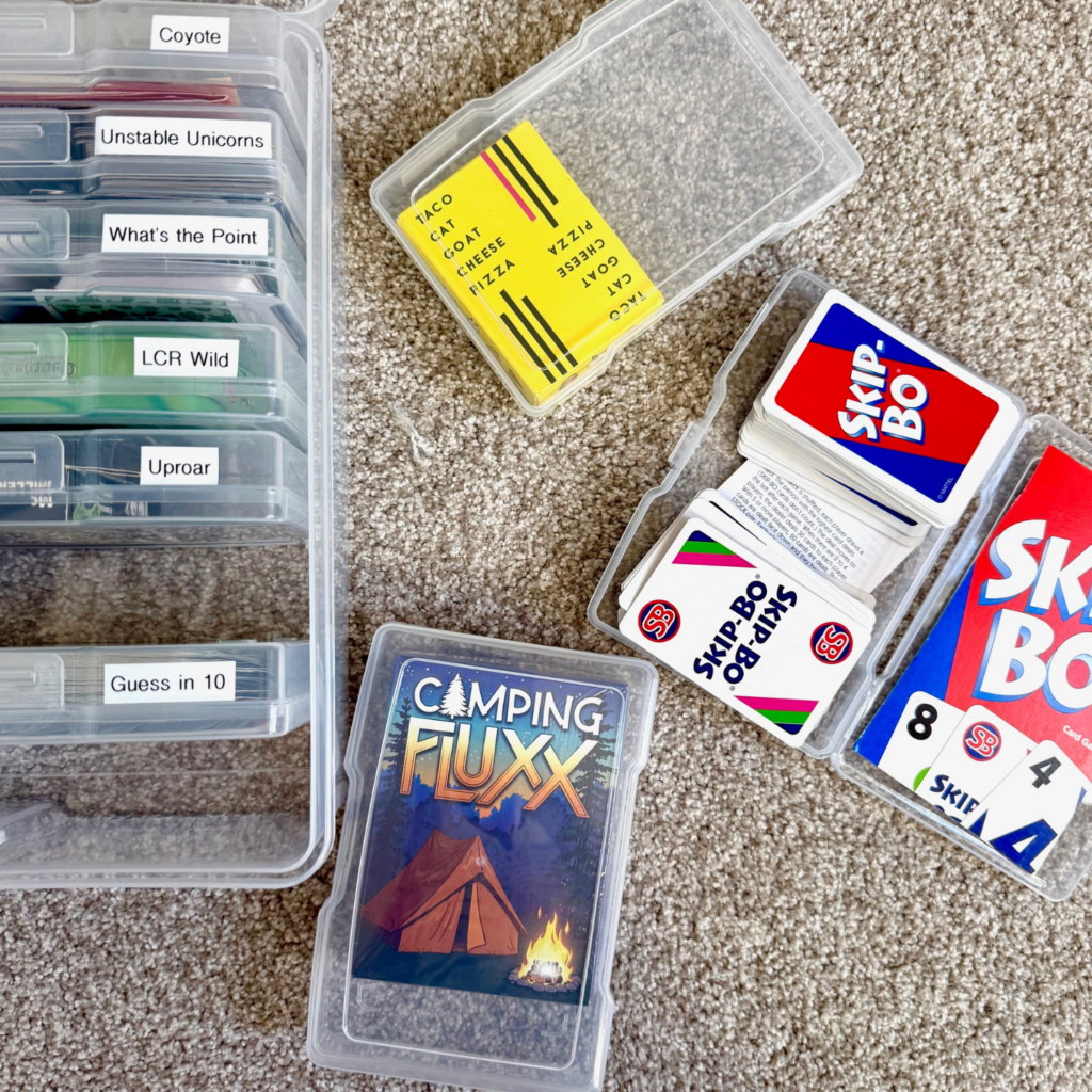 For card games, I took a different approach and used a photo organization bin. This gives me hard shell containers for each game to go in and a case to carry it in.
