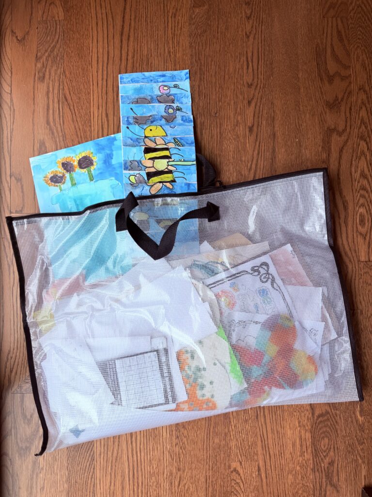 An inexpensive portfolio bag for each kid has been my go-to for years. These help me sort, prioritize and organize. Instead of art cluttering drawers, walls, or space in my brain, I make a decision (display, pitch, or keep?) then move it to its dedicated home.