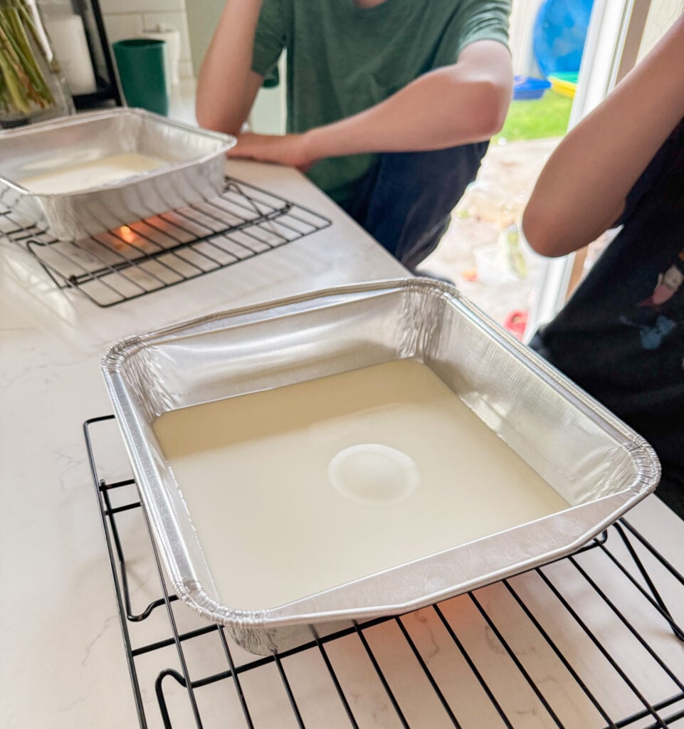 To understand how the hot magma in the Earth could push up a plateau, we did a demonstration. In foil square pans, we poured in oobleck (2 cups cornstarch mixed with 1 cup water). We set the pans on cooling racks and placed a lit tea candle under the pan.